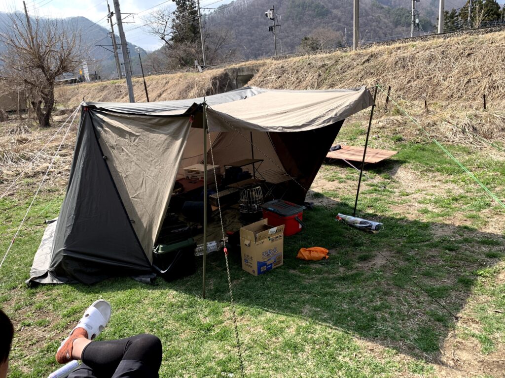 目覚めると4時、昨日の夜は薪ストーブもアルパカストーブもいらないくらい暖かくビックリ!しかし朝方寒いと感じたのでアルパカストーブをつけました。朝6時すぎ相変わらず曇り空です。栃木の山といえど4月、2月ほどの寒さはなく楽な夜でした。二男が起きるまでコーヒーなどを飲みボーっとしてます。ほっておくといつまでも寝ているので8時過ぎに起こし遅めの朝食を食べて撤収します。初めてのキャンプ大したトラブルもなく無事終了しました。