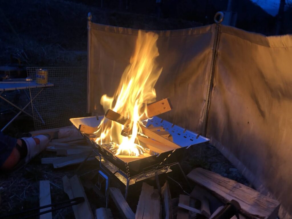 お風呂から上がりいよいよ焚火台に火入れします。今回は2人なのでロゴスの焚火台です。