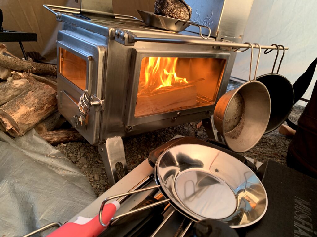調理をするときは火力が欲しいので薪をたくさん入れるのでテントの中はポカポカです。